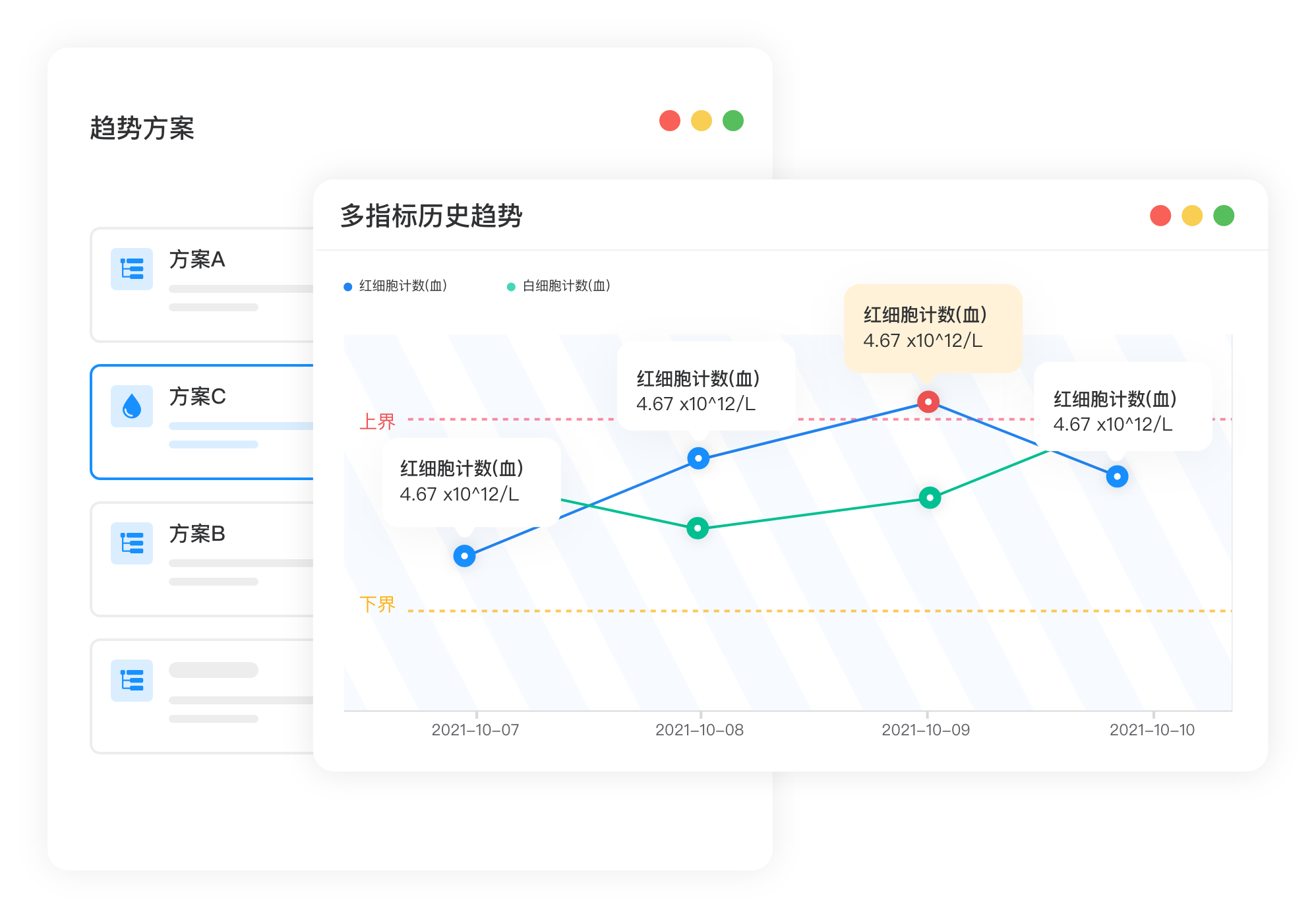 您可自由配置任意數量項目組合,并在同一量綱下顯示項目組合所有結果的變化趨勢。實時查看病情發展、分析用藥效果。